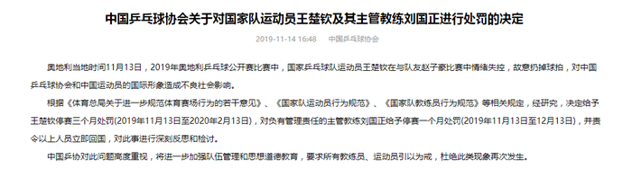 乒协官网公布处罚决定。网络截图