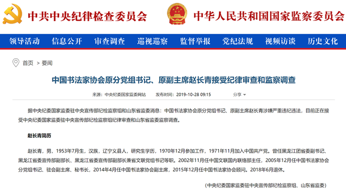 2019年10月28日,中央纪委国家监委网站发布消息,中国书法家协会(下称“中书协”)原分党组书记、原副主席赵长青涉嫌严重违纪违法,目前正在接受调查。