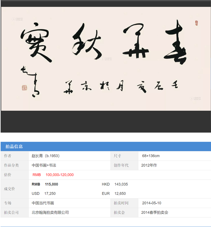 国内某拍卖网站,赵长青作于2012年一幅字以11.5万元拍卖价成交。 网络截图