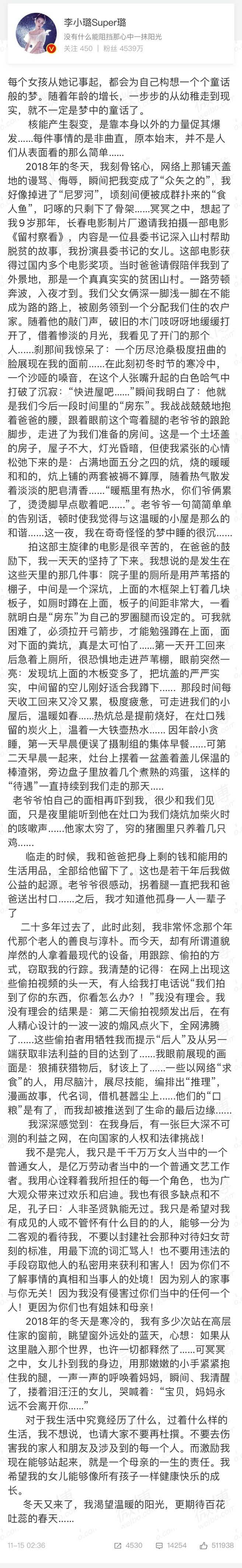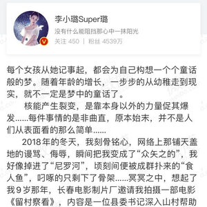 李小璐还称,“不要以封建社会那种对待妇女苛刻的标准,用最下流的词汇骂人!你们不了解事情的真相和当事人的处境!”她希望大家能客观看待她,不要伤及家人和朋友。