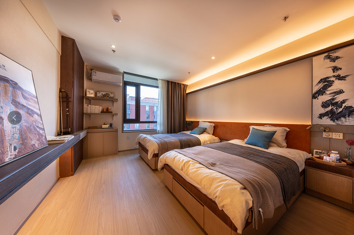 北京随园养老中心总建筑面积4万㎡,整体规划7栋楼、700余张床位,采用“邻里式主动社交+全方位健康照护”的照料模式,为老年人提供自理、介护、介助“一站式”的养老服务。当老人身体状况良好时,可以在自理楼内养老,社区内设有阅读视听、棋牌运动、书画音律、舞蹈瑜伽、茶饮水吧、休闲会客、阳光私宴等20余个功能空间,满足老人的各种兴趣爱好。而当老人自理能力逐步下降的时候,可以搬到护理楼继续生活,社区内配备有万科光熙康复医院的24 小时医护团队,五公里急救通道也可在十分钟内直达房山区良乡医院。