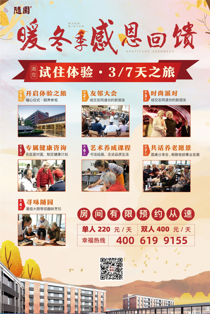 北京随园养老中心为了解决长辈们的疑虑,特此推出3/7天超值试入住体验活动,只需要花费一个成本价格,即可体验随园的吃喝玩乐一站式服务,全方位体验五星级的退休生活。拨打下方海报上的电话,即可优先选房。
