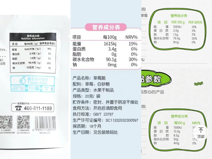 另外,冻干果蔬虽然经过处理变得娇小轻便,但是这些产品的含糖量问题令人担忧。新京报记者比对几种冻干果蔬的营养成分表发现,多数产品的碳水化合物含量都比较高,最高的每100克中含有碳水化合物90.1克。