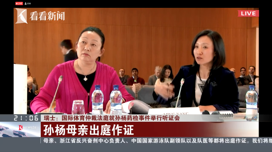 2018年9月4日事件发生时,杨女士全程在检查站和会所里。提供证词时,她描述了她和IDTM样本采集人员在检查期间进行的交流。WADA法律顾问在庭上就证词中的报警一事提问道:“你当时要报警,是吗”孙杨妈妈回答:“我说不是我要报警,是我要给警察打电话。”随后她就报警一事做了补充陈述,称自己事后十分的后悔。