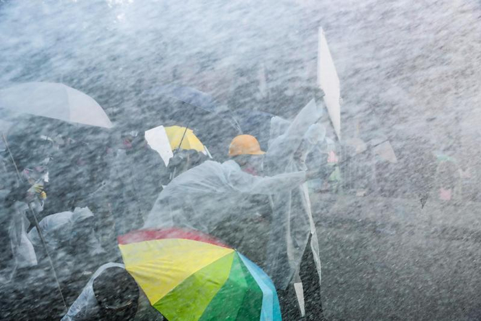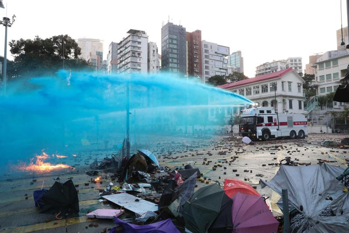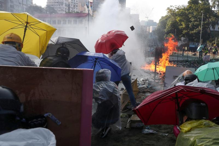 一夜硝烟未尽,第二天(17日)早上,有一百多名市民自发到理工大学附近清理路障,黑衣人随即与市民发生冲突,防暴警察赶到现场进行驱散。冲突从早上一直持续到半夜,数不清有多少次,暴徒形成伞阵推进,警方出动水炮车喷射蓝色水剂,黑衣人疯狂投掷汽油弹形成一片火海。水、火和烟雾充斥在这个小小的路口,漫天的胡椒烟雾将道路、建筑和空气都染成了蓝色,让人窒息的气味久久不散。