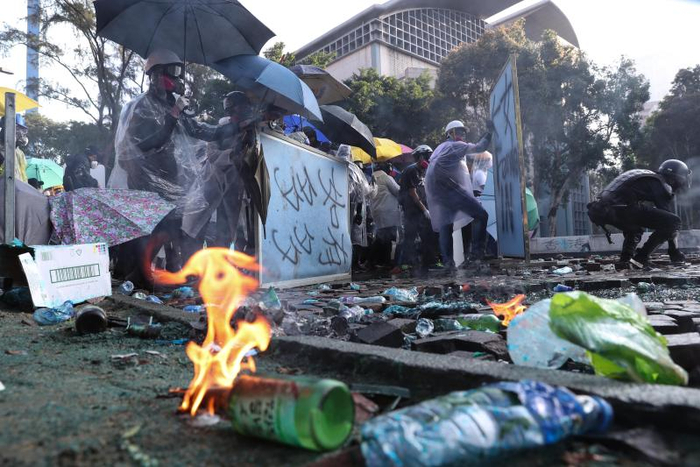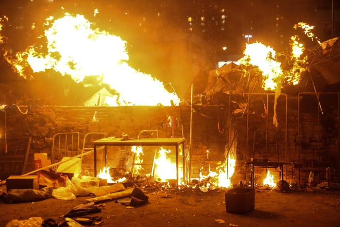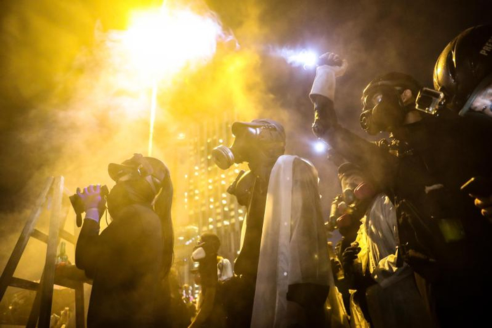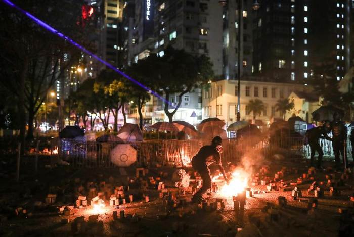 16日晚,暴徒与警方首次在漆咸道南和柯士甸道路口形成对峙。这一夜,密集投掷的汽油弹在历史博物馆外形成冲天烈焰,火光把夜空映照得如同白昼。冲突持续到凌晨两点,现场留下一片狼藉,黑衣人躲进教学楼内,许多年轻人直接躺倒在如同废墟的路面上。