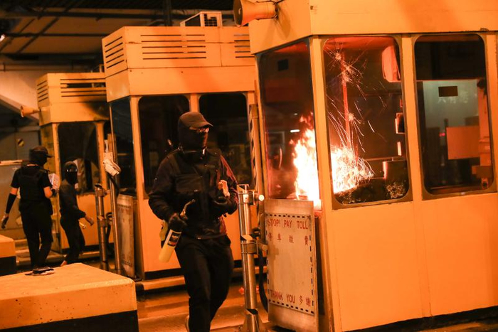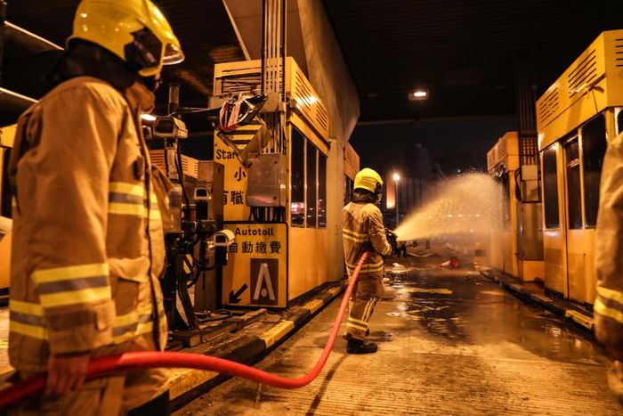 香港理工大学位于香港九龙红磡地区,学校东侧有多座天桥横跨红磡隧道,而红磡隧道,是连接港岛与九龙的交通生命线。14日傍晚,红磡隧道已全面停运,隧道上面的天桥被暴徒用桌椅和杂物堵死,广阔的车道上空无一人,不时有黑衣人在天桥顶上来回穿行,气氛十分紧张。当晚,红磡隧道收费站被几度纵火,消防员扑灭后,黑衣人又偷偷靠近。他们刻意趁消防员不备,把燃烧的汽油弹放在电箱里,而近在咫尺,正在灭火的消防员却对此一无所知。隧道收费站岗亭不断发生爆炸,被烧得熏黑一片,滚滚浓烟弥漫在夜空里,四顾无人的红磡如同一座死城。