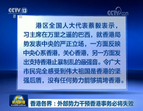 港区全国人大代表蔡毅表示,习主席在万里之遥的巴西,就香港局势发表中央的严正立场,一方面反映中央心系香港,关心香港,另一方面发出支持香港止暴制乱的最强音。令广大市民完全感受到伟大祖国是香港的坚强后盾,没有任何势力能够搞垮香港。