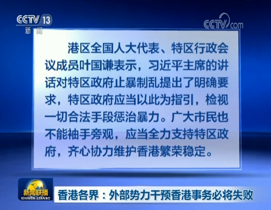 港区全国人大代表、特区行政会议成员叶国谦表示,习近平主席的讲话对特区政府止暴制乱提出了明确要求,特区政府应当以此为指引,检视一切合法手段惩治暴力。广大市民也不能袖手旁观,应当全力支持特区政府,齐心协力维护香港繁荣稳定。