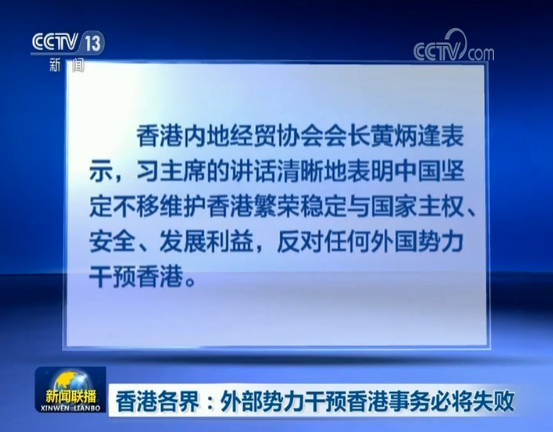 香港内地经贸协会会长黄炳逢表示,习主席的讲话清晰地表明中国坚定不移维护香港繁荣稳定与国家主权、安全、发展利益,反对任何外国势力干预香港。