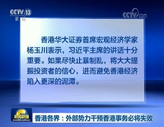香港华大证券首席宏观经济学家杨玉川表示,习近平主席的讲话十分重要。如果尽快止暴制乱,将大大提振投资者的信心,进而避免香港经济陷入更深的泥潭。