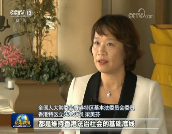 全国人大常委会香港特区基本法委员会委员 香港特区立法会议员 梁美芬:你看到他们(暴徒)实际上,已经到了无法无天的(地步),他们的目的是毁灭香港,所以我认为习主席讲的三个“坚定支持”和三个“坚定不移”,都是维持香港法治基础的底线。我认为香港必须要让全世界很明确知道,我们香港的法律不容许,不能用犯罪的手段来达到政治的目的,特别是不可以伤害整个社会的利益。