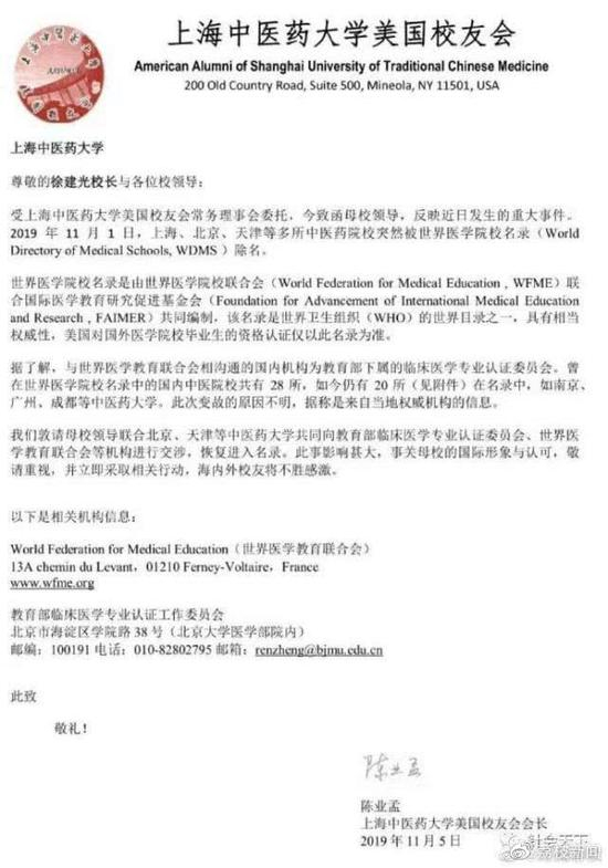 上中医美国校友会称该名录具有相当权威性,美国对国外医学院校毕业生的资格认证仅以此名录为准。希望上中医联合北京、天津等中医药大学共同向教育部临床医学专业专业认证委员会、世界医学教育联合会等机构进行交涉,恢复进入名录。