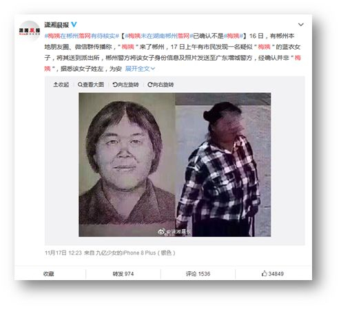 11月13日,广州增城区分局通报了人贩子“梅姨”案的最新进展。通报称,近期找回了其中两名被拐儿童,并组织家属认亲。随后,有关人贩子“梅姨”的图片在新浪微博、微信朋友圈等社交平台如龙卷风一般广泛传播,各地网友共同呼吁寻找“梅姨”下落,再次掀起了声讨人贩子的舆论热潮。