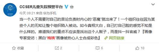 据悉,网络热传的彩色版“梅姨”画像来自于非公安机关权威机构的CCSER儿童失踪预警平台,因此CCSER平台秘书长回应媒体记者时表示,发布这张图片是希望让大家能够关注彩色的“梅姨”画像,有线索及时举报。19日上午,@CCSER儿童失踪预警平台官方微博发布消息,澄清彩色画像的来源及善意的初衷。