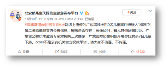 就在公众对“梅姨”外貌的认知即将固化的时候,公安部官微及时发布辟谣消息表示网络上流传的广东增城被拐9名儿童案件嫌疑人“梅姨”的第二张画像非官方公布信息,梅姨是否存在,长相如何,暂无其他证据印证。警醒大众不信谣,不传谣。