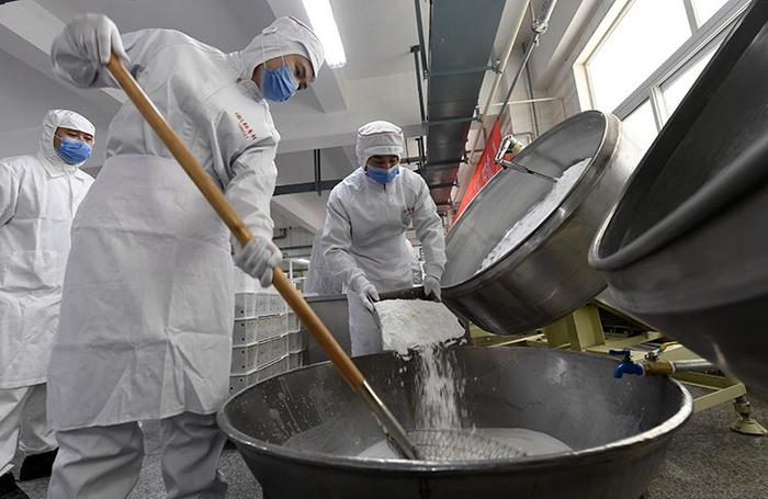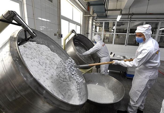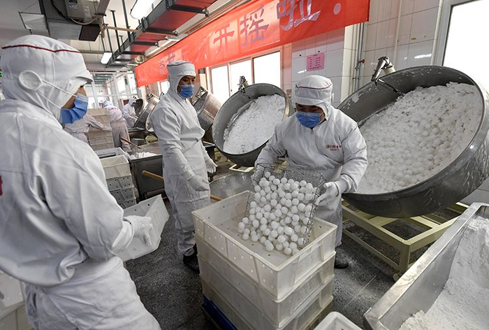 工作人员正在摇制元宵。