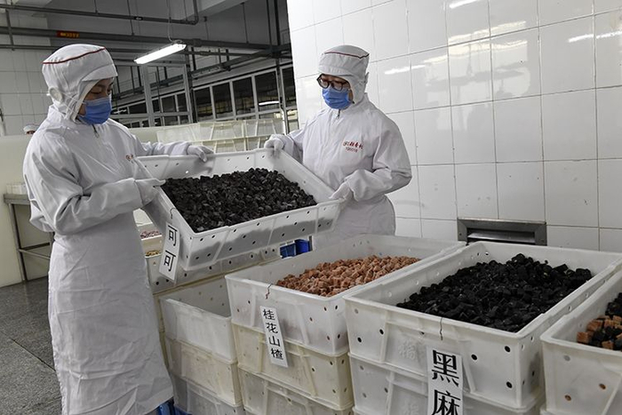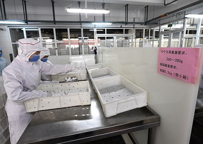 工作人员在分拣元宵。