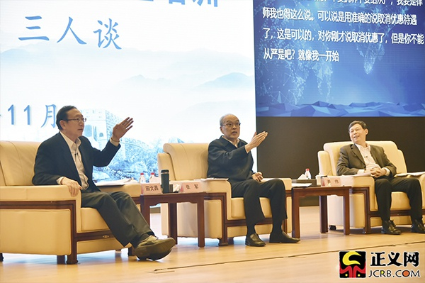 11月18日,最高人民检察院检察长张军、最高人民法院副院长姜伟、全国律师协会刑事辩论专业委员会主任田文昌在国家检察官学院参加“控辩审三人谈”,就认罪认罚从宽制度适用中的重点问题进行深入细致的权威解读。程丁、钟心宇 摄