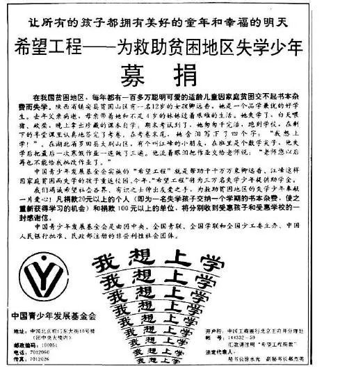 1991年5月25日上午,《人民日报》刊登了“希望工程——为救助贫困地区失学少年募捐”广告。这是《人民日报》发出的第一个公益募捐广告。