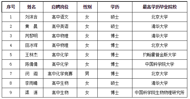 而最近,华中师范大学第一附属中学公布了该校2020年第一轮教师招聘拟录用名单,再次引发热议。在拟录取的9人中,共有6人是顶尖大学博士,其余为硕士。此外,9人中,清华、北大的毕业生有6人,其余3人分别来自美国约翰·霍普金斯大学、中国科学院生物物理研究所和中国科学院大学。