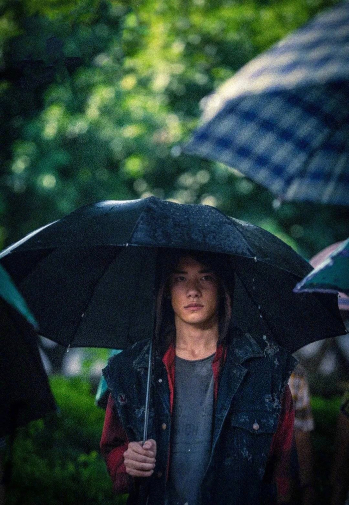 电影中,小北为陈念高考送别的画面令人印象深刻,他撑着黑色雨伞,穿着被磨破的无袖牛仔马甲,站在人群中远远目送。
