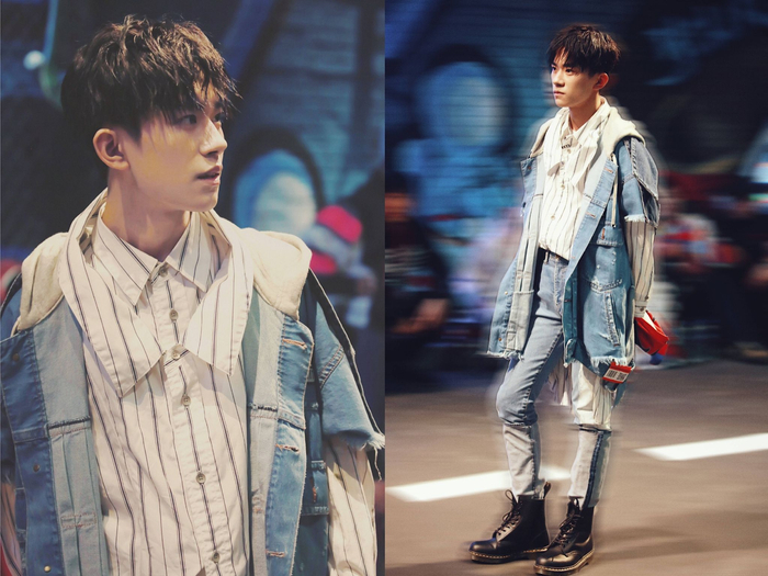 易烊千玺的时尚感很强,留着“鲻鱼头”的他披上“缝缝补补”的牛仔外套,展现出了别样魅力。