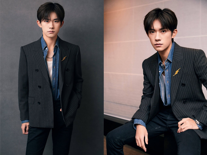 竖条纹双排扣西装搭配牛仔衬衫,简约又不失时尚小心思,复古范儿十足。在闪电造型胸针的点缀之下,更显少年不羁的潇洒气质。不禁引人遐想,这会不会就是小北多年后的样子?