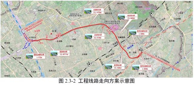 新建线路起自津保铁路胜芳站,上下行线外包津保铁路引出,出站后上行线跨过津保铁路折向西北,双线并行于丰林村西侧跨越112 国道,后向北走行,在张村附近设安次南站,出站后线路折向西北,于东贺尧营村南上跨廊沧高速公路,后折向西在西麻村南侧设永清南站,出永清南站后折向西北引入京雄城际固安东站。
