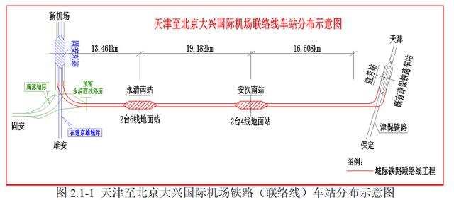 天津西至胜芳利用津保铁路,固安东至新机场利用京雄城际。