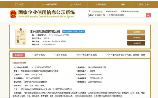 从国家企业信用信息公示系统查询到,负责建设和运营天津至大兴机场高铁的津兴城际铁路有限公司已于11月19日成立。