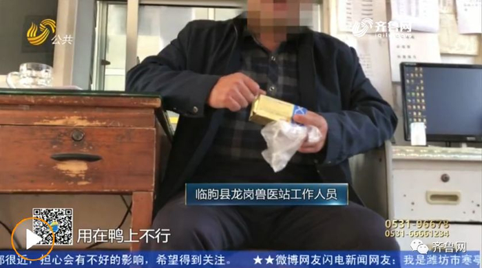 当记者拿着左守健买的疫苗去龙岗兽医站咨询时,一位工作人员斩钉截铁地说,这是这是鸡疫苗,鸭子绝对不能用!那为何推荐给养鸭户呢?这位工作人员又一次肯定回答,这绝不是兽医站卖出去的,谁卖的找谁去。