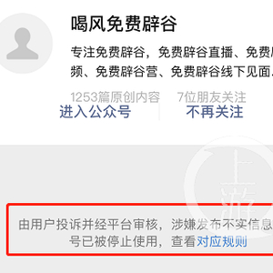 原标题:涉嫌发布不实信息,“喝风辟谷治病”微信公众号已被关停