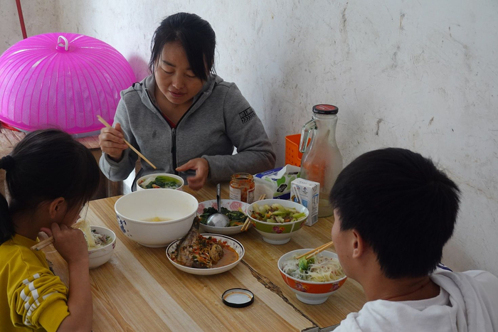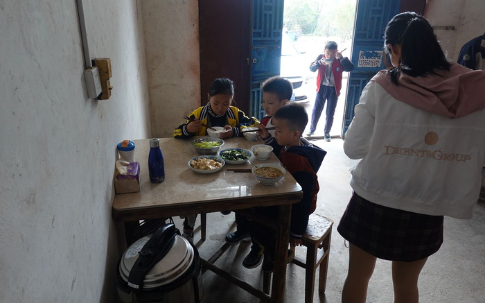 孩子们和家长聚在饭堂里,空了一天的饭堂,忽然间就热闹了起来。七个孩子围在三张桌子前吃饭,聊天的声音,碗筷碰撞的声音,家长询问的声音,交织在一起。肖晓莲家的四个孩子,两个没有椅子,端着碗站在屋里吃饭,有时候还会跑到别人的桌子前,边聊边吃。
