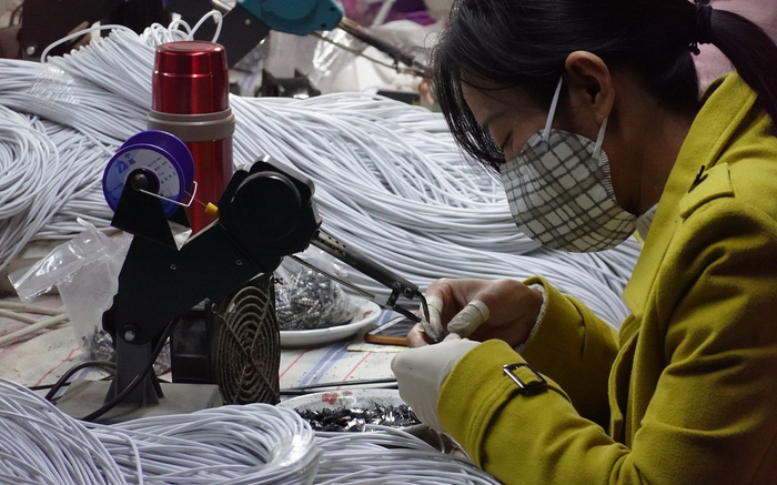 学校斜对面,一间10平方米左右的平房里,摆着三个工作台,几大捆白色的耳机线搭在旁边的架子上,电灯从天花板上垂下来,垂的很低。屋子里很安静,只有一台很小的电扇发出细微的声音。这是一个做耳机线的小作坊。