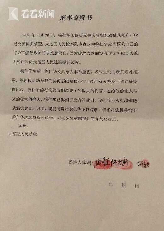 该案经大足区公安局侦查,发现陈明东是因捆绑导致窒息而死亡的。侦查终结,移交大足区检察院审查起诉。该检察院审查认为,徐仁华是因疏忽大意而没有预见自己的捆绑行为而致陈明东死亡,以过失致人死亡罪追究徐的刑事责任,向大足区人民法院提起公诉。陈明东的三位家属同时提起附带民事赔偿诉讼。