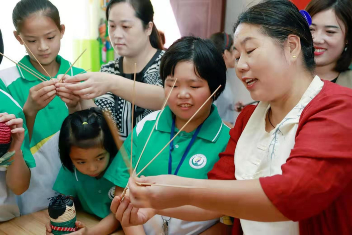大名草编传承人王群英(站立者)传授草编技法。受访者供图