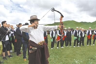 贵南县的塔秀草原上,各族群众一起参加射箭比赛。咸文静摄