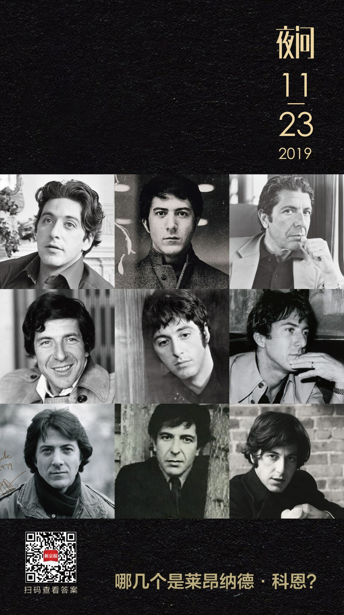 科恩年轻时,认识他的人说他长得像达斯汀·霍夫曼,也有人说他神似阿尔·帕西诺。因此,我们选取了9张三人的照片,考考大家的眼力。也许,连科恩的资深粉丝也未必能全对。
