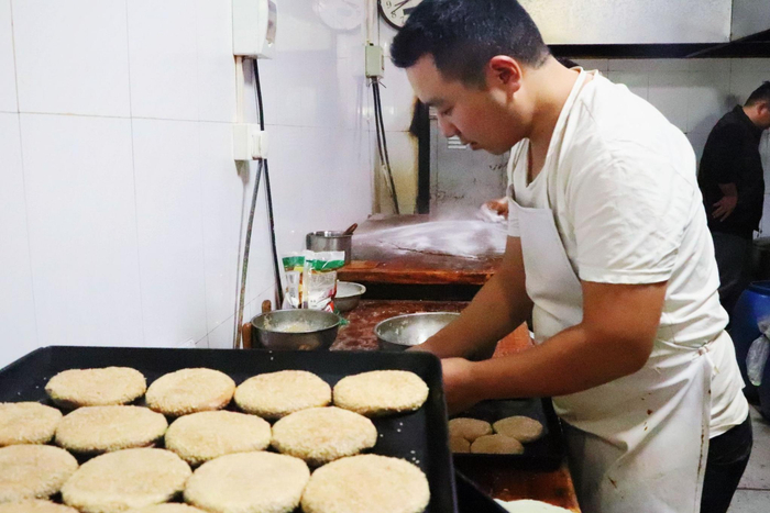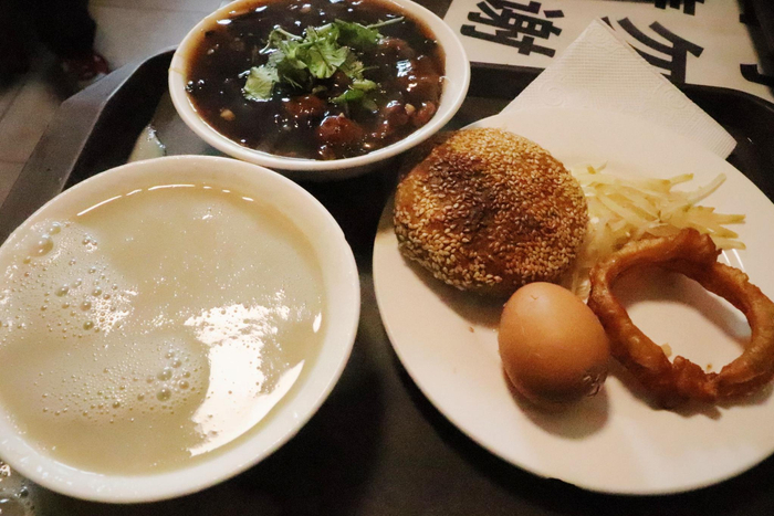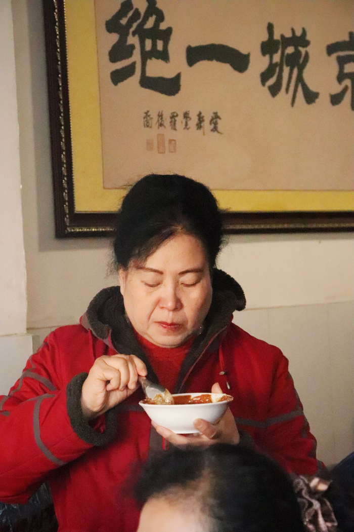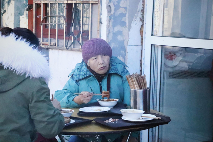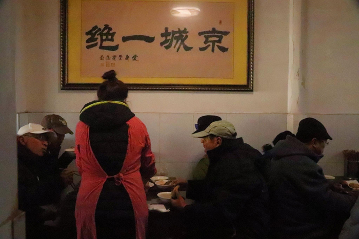 “一碗豆汁儿、一碗卤丸子、两个焦圈、再来盘榨菜丝。”店里的客人八成是老主顾,不用看菜单,张嘴就点。后厨里忙忙碌碌,打豆汁的、做烧饼的、端盘子的……尹三豆汁店店面不大,就十来张桌子,顾客从档口排到店外,端着吃食,开始找座,拼桌是必须的。甭管是岁数大小,这里的顾客都守着一个规矩,吃完了就赶紧给远亲近邻让个座,还有这么多人端着盘子等着呢。