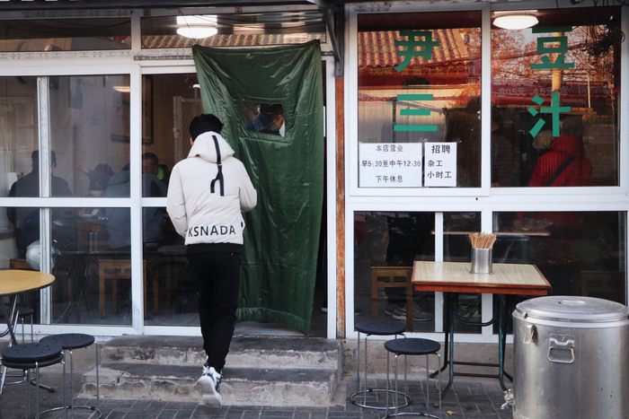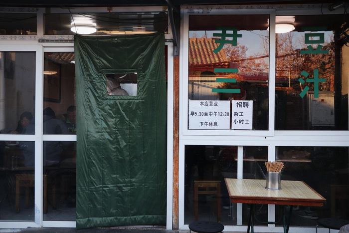 尹三豆汁前后迁址5次,一直没离开过金鱼池和祈年大街这地界,现如今的店面在东晓市街西口。不打眼的小店,挂着绿棉门帘子,这身“行头”仿佛与“米其林”挨不上边。窗户倒映着青色房檐与黄叶枝头,倒是一种别样的冬景。