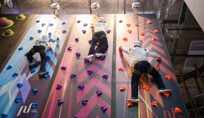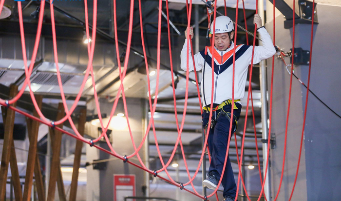 这里的很多项目,既可以单独游玩,也可以与朋友、恋人或家人一起组队PK。在开业现场,北京居然之家投资控股集团有限公司董事长汪林朋,韩国WEPEAK社长洪成煜分别组成两队,带领嘉宾体验各个运动项目,并在攀岩等项目上激烈PK。汪林朋表示,在冬天,这些室内运动有趣、减压、还能热血PK,大人和孩子可以放下手机,一起在娱乐中享受运动。
