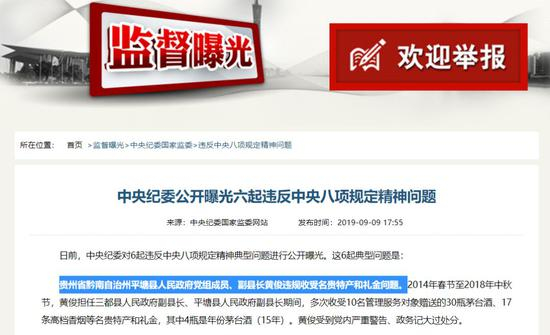 9月9日,中央纪委公开曝光六起违反中央八项规定精神问题。其中第一起案例就是贵州省黔南自治州平塘县人民政府党组成员、副县长黄俊违规收受名贵特产和礼金问题。通报显示,2014年春节至2018年中秋节,黄俊担任三都县人民政府副县长、平塘县人民政府副县长期间,多次收受10名管理服务对象赠送的30瓶茅台酒、17条高档香烟等名贵特产和礼金,其中4瓶是年份茅台酒(15年)。