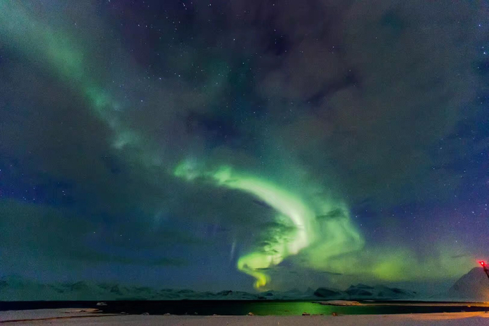 而且极光是会动的。有时候就像一条条舞动起来的绿绸带,边缘处渐渐呈现出红色、紫色。那种舞动时而轻柔,时而激烈,颜色也会发生变化,若隐若现。有时候一部分暗下去了,另一部分又突然亮起来;有时候又会有那种轻柔的、淡淡的极光,你还以为只是天空中飘来了一朵棉花一样的淡红色的云。