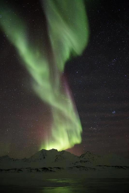 在新奥尔松,可以观测到旋转而上的极光。受访者供图