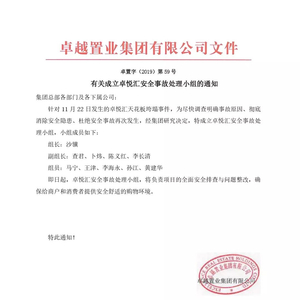 在今天凌晨的公布处理通报中,卓越集团表示对所有受影响的消费者及商户致以诚挚的歉意,同时表示事故发生后公司已采取4项措施:1、由集团执行总裁担任组长,集团质量与客服部、商业公司、深圳置业公司等相关部门负责人参与,全面负责和推进事故的原因调查和问题处理工作;2、已完成受影响区域的现场清理,安排专人值守,继续做好必要的安全隔离和警示告知;其他正常营业区域加强安全巡视,为消费者提供安全、放心的购物环境;3、启动对卓悦汇的全面安全排查,包括但不限于建筑安全、消防安全和商业设施安全的隐患排查;4、积极配合政府监管部门及第三方检测机构对事件原因的调查工作,相关工作正在进行中。在同时公布的《有关成立卓悦汇安全事故处理小组的通知》中,10人组成了卓悦汇安全事故处理小组,负责项目的全面安全排查与问题整改,卓越集团执行总裁沙骥出任组长。