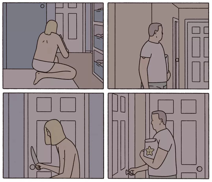 有一个对比的镜头,当凯文回家开门的时候,特迪在门的另一侧握着刀。