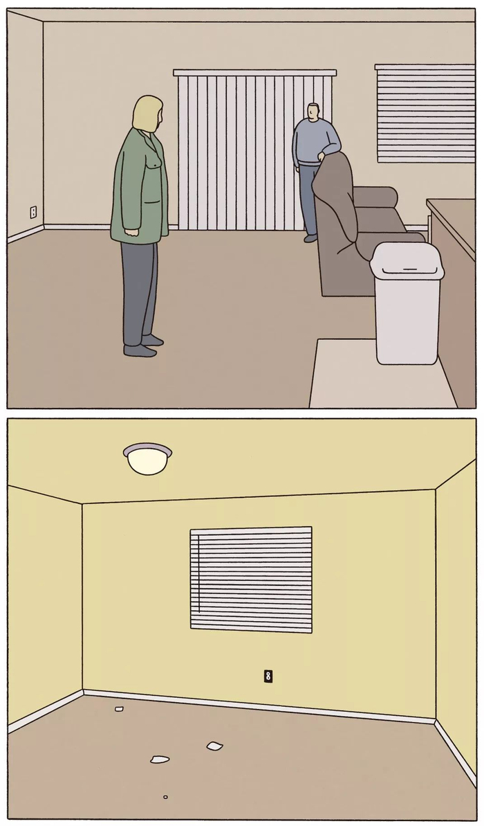 从第一页开始,尼克·德纳索便为《消失的塞布丽娜》奠定了一种灰暗的、充满疲惫感的基调。重复的场景分镜,朴素的线条勾勒,没有亮光的眼睛,每个画面中的人物都退化成色块。我们想从图像中找到由设计灵感带来的寓意,想找到缤纷想象力带来的共鸣,但只能失败。作者冒着消隐自我的风险,将视觉的冲击力降到最低,以此来形成另一种在图像小说中罕见的冲击感。
