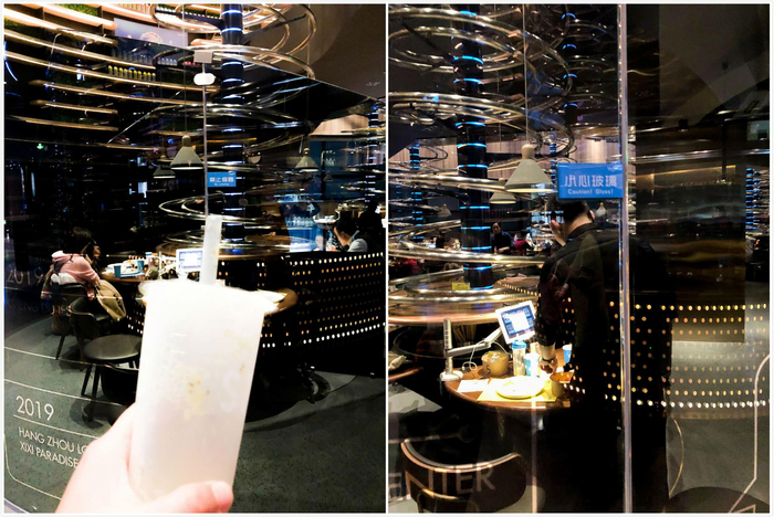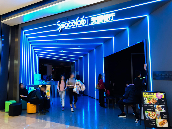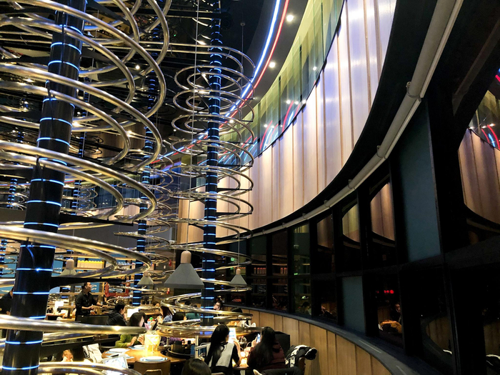 餐厅位于世纪金源商场五层,店内面积超过一千平方米,安置了24条失重螺旋轨道为顾客上菜。顾客使用平板电脑点餐后,信息会实时同步到不同的厨房档口(主要分为饮料区和主食区)。餐食做好后,不同档口的厨师会根据顾客下单信息出餐,并将包装与餐桌颜色对应的餐品传递给双螺旋轨道,用失重原理飞速送餐到桌。