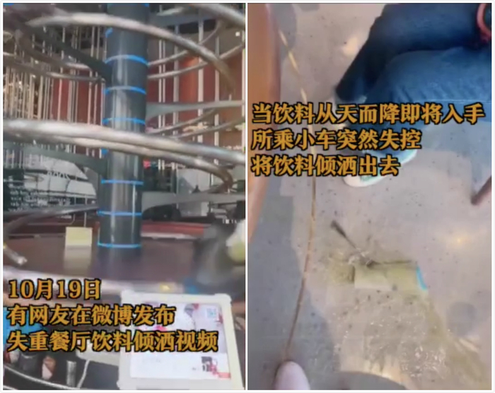 “就像欢乐谷的极速飞车,瞬间像子弹一样飞向云霄,经过一连串俯冲、攀爬、滑行,心脏忽上忽下、面部表情狰狞”就像失重餐厅官方形容的那样,最为标榜的轨道传菜有点“刺激”。10月19日,有网友在微博上发布失重餐厅饮料倾洒视频。当饮料“从天而降”即将入手时,小车突然失控,将饮料甩了出去。